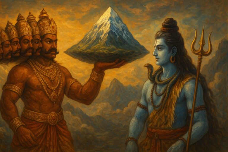 रावण पर्वत को अपने हाथो से उखाड़ने का प्रयत्न करने लगा और उसी दौरान भगवान् शंकर को इसकी आहट हुई और उन्होंने अपनी पैर के अंगूठे से पर्वत को थोड़ा बल दिया। Image - AI Generated